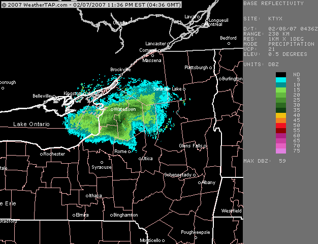Here is a radar animation view of the strong, single band affecting areas directly east of Lake Ontario around midnight, Feb 8, 2007 (courtesy of WeatherTap).