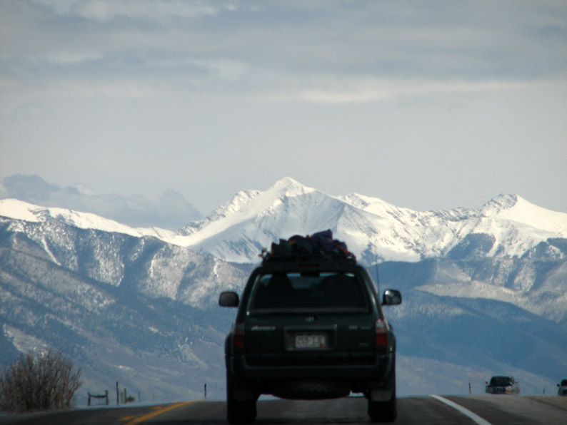 This five day trip required a ridiculous bevy of gear. Due to the uncertain Spring snow conditions, I took technical snow climbing equipment (crampons, ice axes, helmet, snowshoes, skis and ski boots, and trekking poles. I also took four different backpacks: a full expedition backpack, a pack for longer day climbs, a Camelbak (in case we did any shorter climbs or runs), and a pack specifically for carrying skis. With all the assorted clothing and multiple pairs of gloves, jackets, etc., my Pontiac Bonneville trunk and three car seats was nearly full with just my gear! The trip started in earnest when I met Eric at his house in Boulder late Thursday morning. The third member of our group, Alison, showed up a few minutes later. We combined all our gear into Eric's Adventuremobile (Toyota 4Runner) and headed down to the flagship REI in Denver - I still needed to pick up some mountaineering boots that could accept crampons. Using my double plastic boots seemed like overkill, but my old hiking boots were not really up to the task of technical snow climbing. After about an hour and a half, I finally found some boots that would work and we headed down the road again. We headed down US-285 and traversed the high elevations of South Park, then headed down into the Rio Grande river valley.