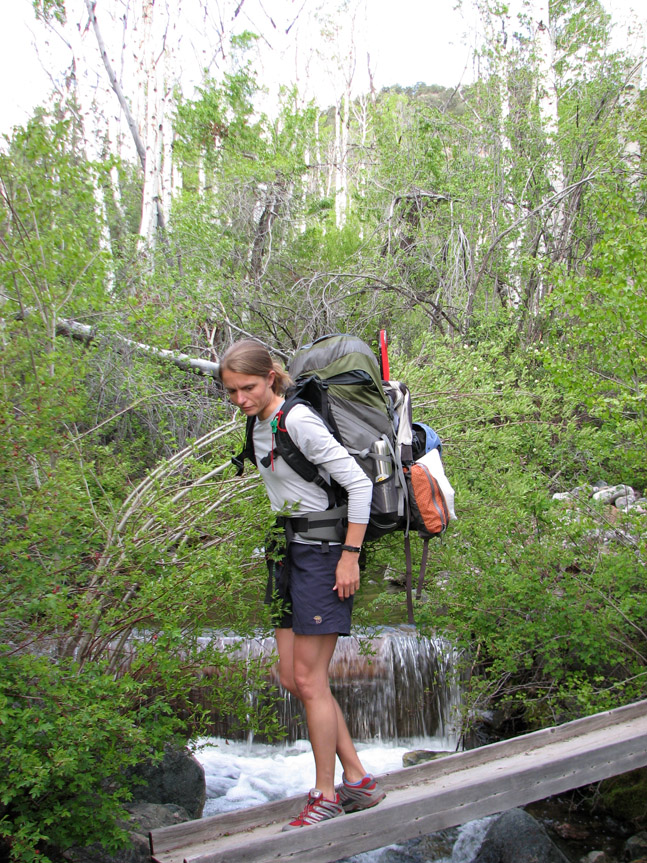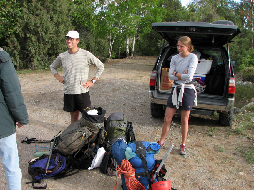 We had a bit of trouble finding the obscure "trailhead" for Spanish Creek. After going too far, turning around, and coming back, and turning around again, we finally located Spanish Creek at around 5:45 PM (it is just after the Ashram and just before the Zen Meditation Center). There was a pullout plenty wide enough to park in. A local out walking his dogs stopped and informed us that in just a few weeks, it was likely that the Spanish Creek trailhead will be closed to hikers and that the sheriff would be given authority to tow cars. The Spanish Creek approach passes through private property and apparently the property owners don't like hikers passing through their land. The Cottonwood Creek Trailhead, just a couple miles further south has apparently also been closed. Willow Creek Trailhead is now the only official trailhead access from the west side of the Crestone Group. After packing and repacking our packs, we finally settled on the essentials that we would need. The weather forecast for the next day (Friday, May 25) was sounding iffy, so we decided to take two night's worth of food in case we needed to stay up there an extra day. This turned out to be a wise move. All of our packs were heavy, but mine was probably the heaviest, at about 50+ pounds. My pack is a 6000 cubic inch expedition pack (L) which weighs 6 pounds itself with all the side and back pockets. Because my pack is so large, I had to carry another backpack to use for the actual climb of the peak! Eric's pack (R) was much smaller, but was very dense - he was carrying the rope and the "tent" (a very lightweight, but spacious tarp shelter).