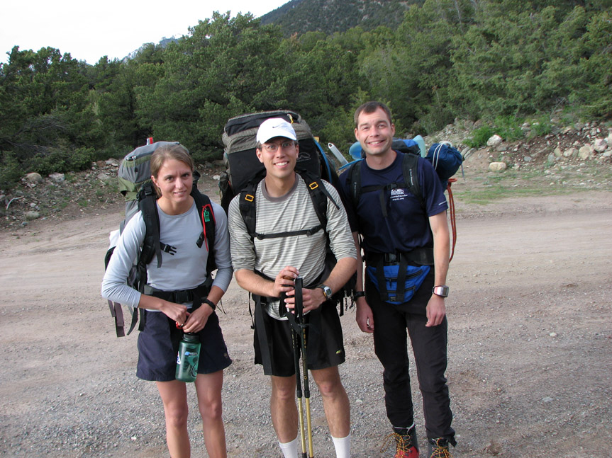 Here is the obligatory "group photo" - it's always a good idea to take one of these to do a "before" and "after" comparison. From left to right: Alison Ordelheide, Jonathan Vigh, and Eric Sigler. We left the trailhead at 6:20 PM. We hoped to get up to 11,000 feet level of the basin where some good camping spots were to be had. But this was 3.5 miles up the trail, and 2800 feet of climb (we started at 8200 feet). And sunset was about 2 hrs away!