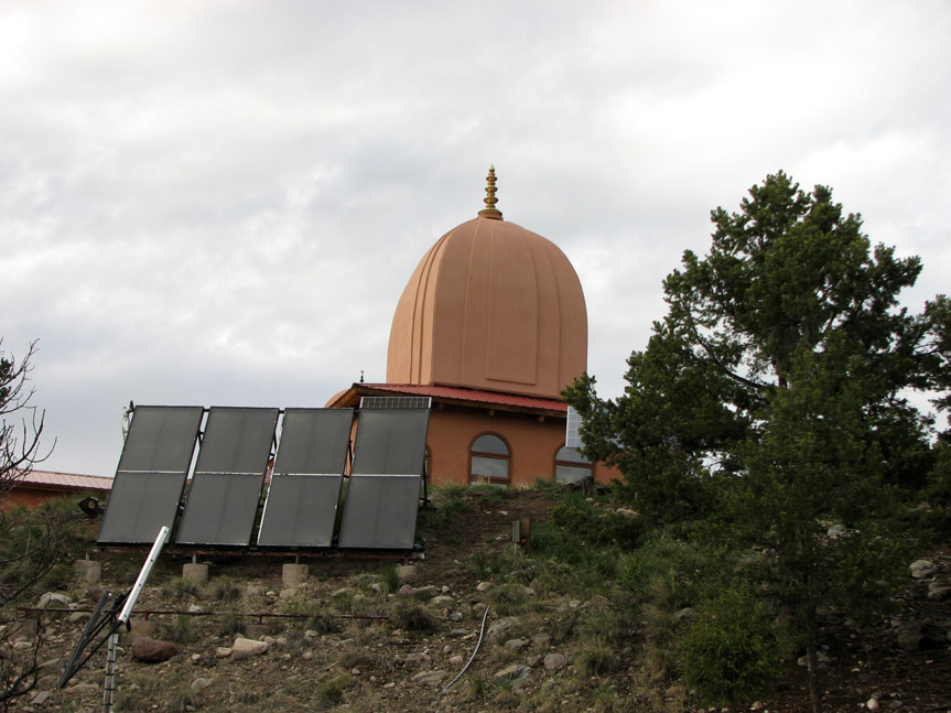 The "trail" is marked by a sign which reads Huia Temple Path. Soon the trail passes below a solar-powered Ashram.