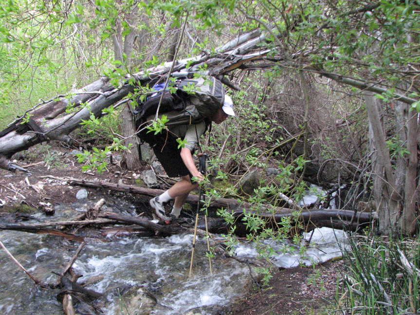 We got confused on when and where to cross Spanish Creek (Gerry Roach's book says that the trail crosses to the south side twice). We tried crossing to the south side on this little bridge, but there didn't seem to be a trail on the other side, only a thicket of dense underbrush and thorns. We came back to the north side and bushwhacked through the vegetation, eventually something resembling a trail. But soon the canyon walls closed in and we had to choose whether to go up or cross the creek. We went up a steep slope and started skirting along ledges 35 feet above the creek. This didn't seem right - the Spanish Creek approach had been described as difficult, but we didn't expect it to be this baffling. After skirting across a particularly interesting cleft in the ledge, we decided to bushwhack back down the creek and find another way. We crossed the creek and soon found a good trail on the south side.