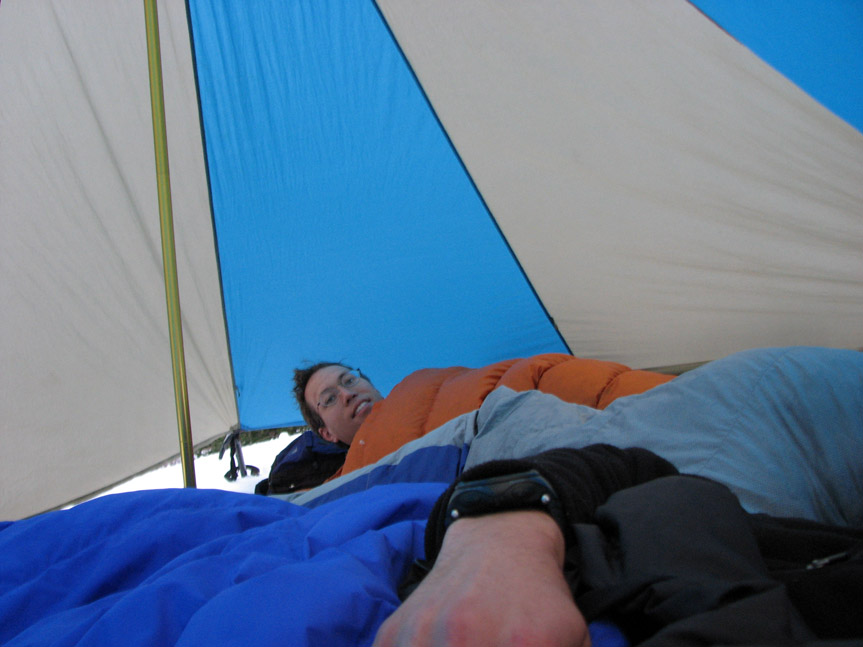 At about 1 PM, the clouds cleared off and the sun came out. The weather was playing tricks on us - we began to wonder if our decision to turn around was really necessary. But then another bout of winds and precip came in at about 2 PM. I retreated to the tarp shelter and read for a while, then drifted off for a pleasant nap. When I woke up, the sun was shining again and it felt like it was 80 or 90 degrees inside - the sun was back out and the tarp shelter had warmed considerably. Even though it was still in the 40's, this felt a little like being at the beach!