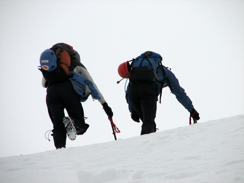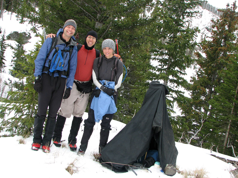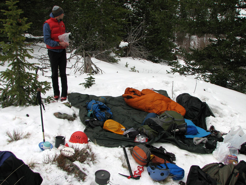 I didn't sleep very much the first night. I am a notorious bad sleeper when it comes to camping, and this night wasn't the exception. First, a very strange creature started wailing somewhere outside of camp at around midnight. It was a very odd sound that I couldn't quite place - maybe a sick coyote, a disgruntled moose, or pandering raccoons? Then a windstorm blew up at around 2 AM - for a while the tarp shelter made quite a racket and some snow pellets fell. We had staked the tarp down with our ice axes, and thankfully these held, but the weather was sounding a bit ominous for tomorrow's climb - the National Weather Service had been talking about a weak disturbance coming through on Friday, bringing a chance of rain/snow and wind gusts of up to 35 mph. We were hoping it would pass by quickly overnight . . .