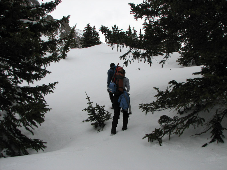 The snow quickly deepened from the 4-12" around camp to several feet deep in the trees. There were quite a few places where the snow was soft, leading to "postholing" (that is when you fall through the snow, sometimes up to your hips, leaving a "posthole"). It was definitely good exercise - I was beginning to wonder why I left my snowshoes at the car.