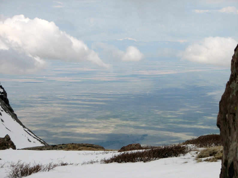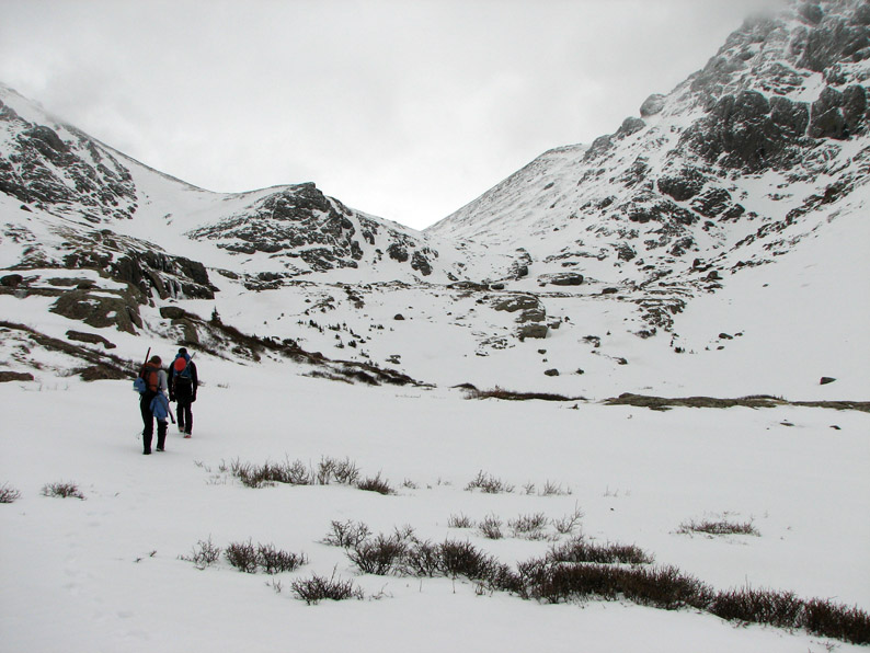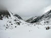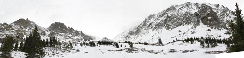 For a while, the weather looked like it might cooperate. At camp, it was 34 degrees when we left. As we climbed, the temperature dropped and the winds picked up. It definitely felt like winter. Here is a panoramic view of the basin looking southeast. Click the picture for a full size version [495 Kb].