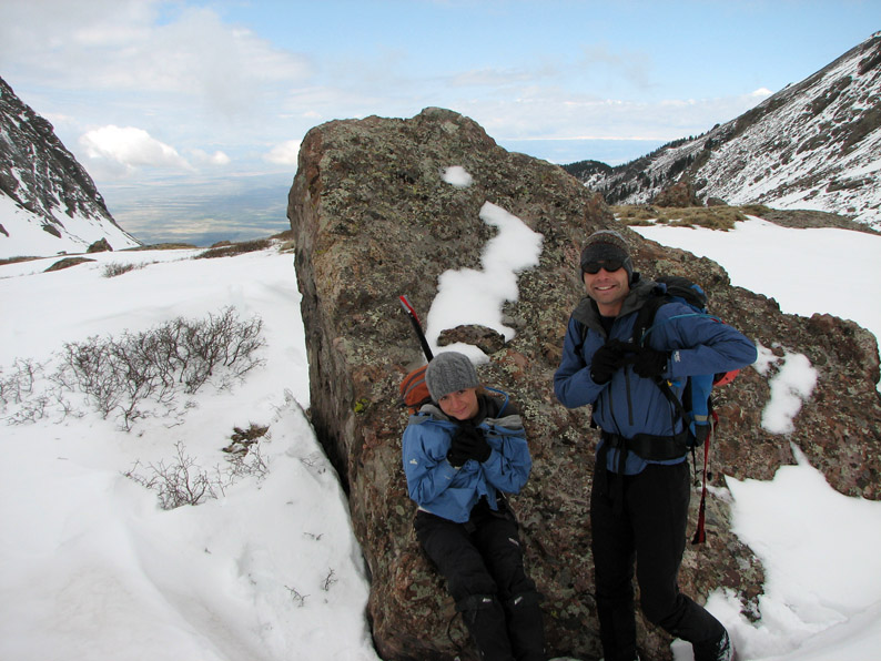 We stopped behind this big rock to grab some nutrition (I enjoyed a classic of cold weather mountaineering, a Little Debby 'Nutty Bar' - these are great because they don't freeze like some other snacks, yet provide over 300 calories of tasty energy).