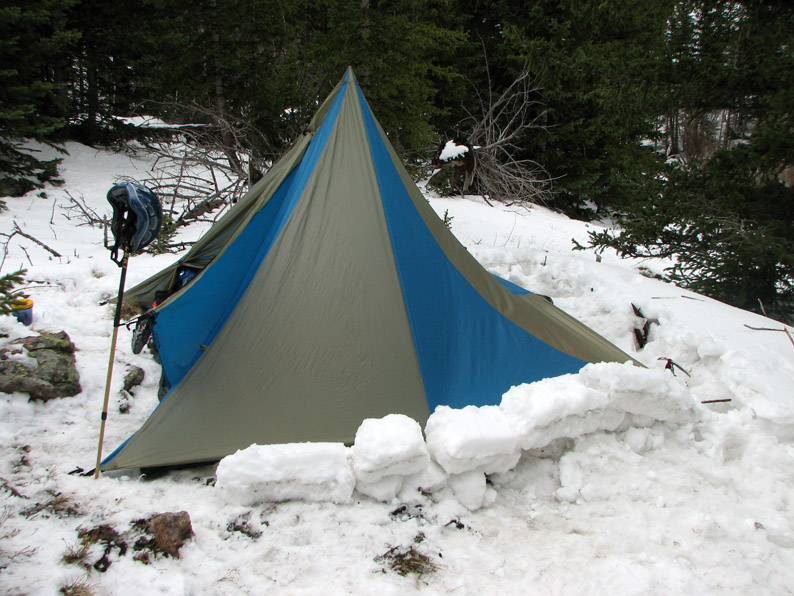 After following good trail for another mile, we somehow got off track and ended up near the bottom of a steep hill filled with downed trees. It was starting to get dark, and we still had about 700 feet to climb and maybe a mile to go. And it was getting quite dark . . . This was turning out to be a challenging backpack. We powered up through the tangle of fallen trees and found the trail, but then the magnitude of our challenge became more apparent - the downed trees were part of an immense burn scar which stretched up the valley. We crossed dozens of downed logs which were made even more slippery by the recent snow. I banged my knees several times - blood started to ooze. Then the moon started rising, bathing the stark landscape. As the remaining glimmers of dusk were departing to the west, we finally reached the trees and quickly settled on a campsite. it was the first protected and fairly flat area that we came to, and happened to be close to a small brook. We weren't picky - we pitched the tarp shelter and settled in. After a hot meal, we hit the sack at around 11 PM. Snow Camping and Views from Camp