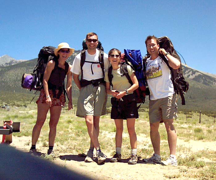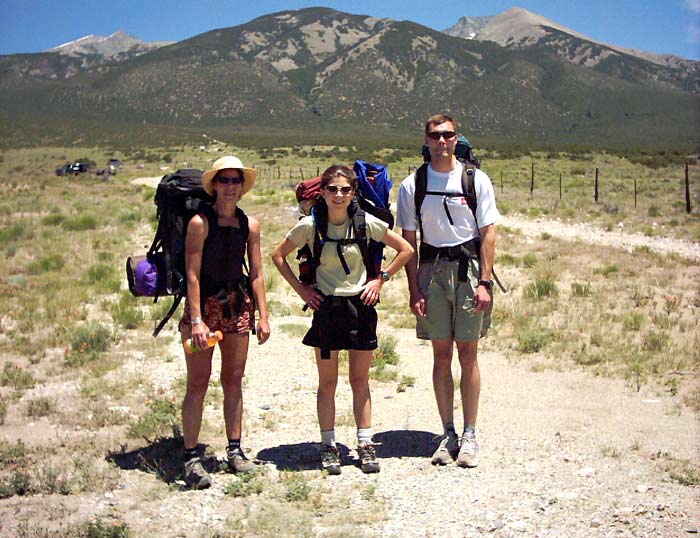 Blanca and Ellingwood are a very long ways from Fort Collins, where I live. On Friday, June 27, I drove down to Eric's house in Boulder and we continued on to Salida to stay with Sara, who was very gracious in opening her home to us. On Saturday we hung out in Salida for a while, taking in the ambiance of the Art Walk festival and the river, then finished packing and hopped in Sara's car at about 11 AM. We picked up one of her friends, Ricky, and drove to the Lake Como Trailhead which is on a lonely dirt road off of Colorado 160. Our excitement was building after driving through the barren San Luis valley for the last hour. We parked just as the road began to climb up the slopes of the Blanca Group. Starting elevation: 7700 feet, one of the lowest 14'er trailheads in Colorado!