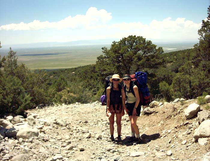 This is the view after climbing about 2 miles and 1500 vertical feet to perhaps the end of the second switchback. Sara and Ricky are still wearing smiles -- they are enjoying the intense workout! The thin strip of pavement just beyond the trees is Colorado 160, near the trailhead. For about the first 2000 vertical feet, the car was still visible, which was a bit disconcerting. As we continued to climb, the horizon lifted and the San Luis Valley became three dimensional. We could tell that we were getting higher. For the geometry lovers out there, we were leaving Flatland.