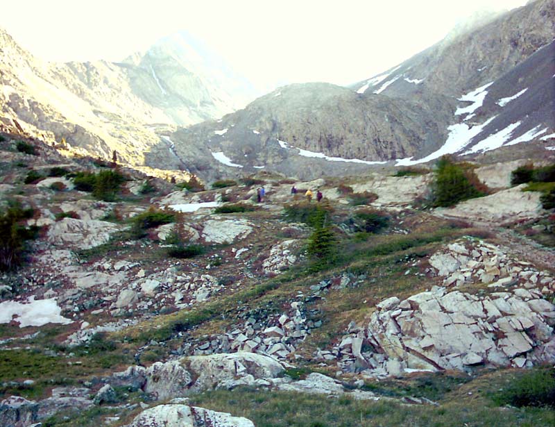 Since the sun rises very early in Colorado in the summertime, we woke up between 5:30 and 6:00 AM. The temperature was a mild 40 deg, considering that we were at 11,700 feet. After trying to reinforce our bodies with some oatmeal and fruit along with other varied snacks, we set off into the upper reaches of the Lake Como Basin. Despite our 4000 feet climb yesterday, we still had 2300 more feet to climb to get to Ellingwood's summit, the lower of the two 14'ers.