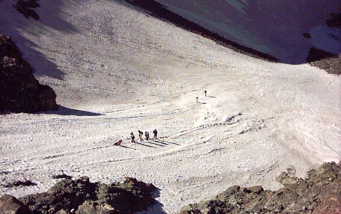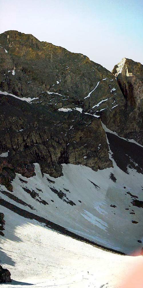 This 'upward' panorama gives you an idea of the sheer size of Blanca. Note the minuscule hikers near the bottom! We searched for an easy way up to Ellingwood. Eric decided to scale a trough that lead to the summit. Sara, Ricky, and I opted for a more circuitous, but less steep route that wound through a couple snowfields.