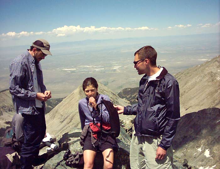 After about an hour and a half of some careful route-finding, we powered up Blanca's steep northeast ridgeline and summitted about about Noon. Several other groups were already up there.