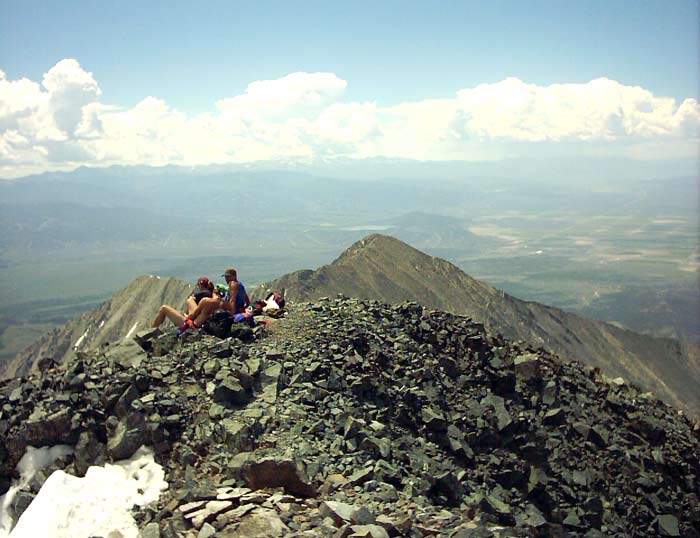 To get an idea of where we were, here is a picture taken from Mount Lindsey on a previous expedition looking towards Blanca and Ellingwood. Blanca is on the left and Ellingwood is the lesser peak in the middle. From this perspective, it is easy to see why Blanca is only approached from the west by the casual mountaineer. The eastern approach is only for the seasoned climber! Continuing up the connecting ridge, we finally reached the summit of Ellingwood, about two and half hours (and 2 miles) after leaving Lake Como.