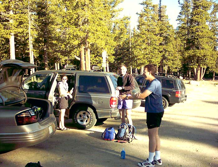 The approach was quick and easy. We left Boulder at about 6:15 AM and arrived at Echo Lake at 7:15 after an exhilarating and surprisingly traffic-free ride up Clear Creek Canyon. At the start, the weather was clear and crisp, with a 49 deg temperature and light winds. Despite the chill, we all wore shorts, lightweight clothing, and trail running shoes -- as Eric likes to say, "Light is fast, fast is speed, and speed is safety," which basically means that on a 14'er hike, you shouldn't take more than you really need, because that slows you down, and then you need more food, water, and clothing because you're going slower and will be on the mountain longer, and then you go slower because you're carrying so much stuff, and so on . . . Anyway, we took enough clothing to keep us warm should a sudden thundershower or sleet storm overtake us, but we left the heavy parkas at home, opting instead for thin wind shells and moisture-wicking clothing.