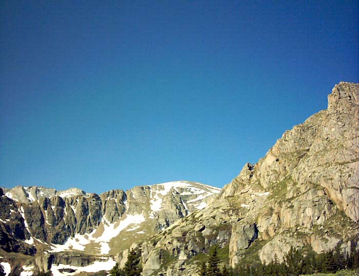 Mount Evans is the fourteenth highest 14'er in Colorado and one of the two 14'ers whose summit is accessible by passenger car. With the highest paved road in the United States, anyone with sufficient driving skills, a road-worthy car, and gumption (there aren't many guard rails) can get to the 14,000 foot level quite easily. But for a real challenge, the proper way to visit Mount Evans is by a heart-pumping, lung-testing hike. On June 22, 2003, Eric, Phil, Sara, and I set out for such an adventure.