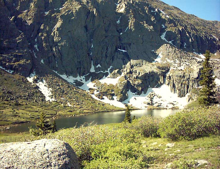 From the parking lot at Echo Lake (El. 10,600 ft), we traversed the SW periphery of the lake and found the Chicago Creek Trail leading into the woods. After a slight rise, the trail headed south and descended into Chicago Creek basin. After crossing a babbling brook about half a mile down and 300 feet lower, we met up with a dirt road. Gradually climbing, we soon passed a lake that seemed to be part of a hydropower project. After about a mile on the road, we passed a couple cabins and came upon the real beginning of the wilderness. Signing into the trail register as the '???' group, we started our sojourn into the wilds of upper Chicago Creek basin. The trail climbed through some recently burned areas as well as some gorgeous meadows. The wildflowers were just starting to come out at 11,000 feet.