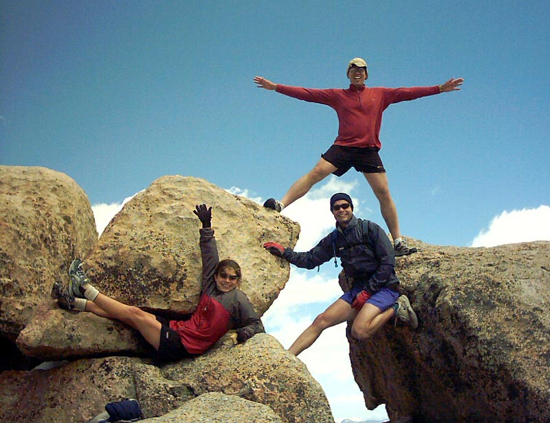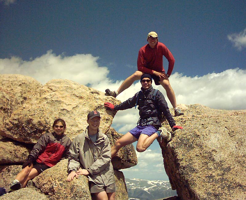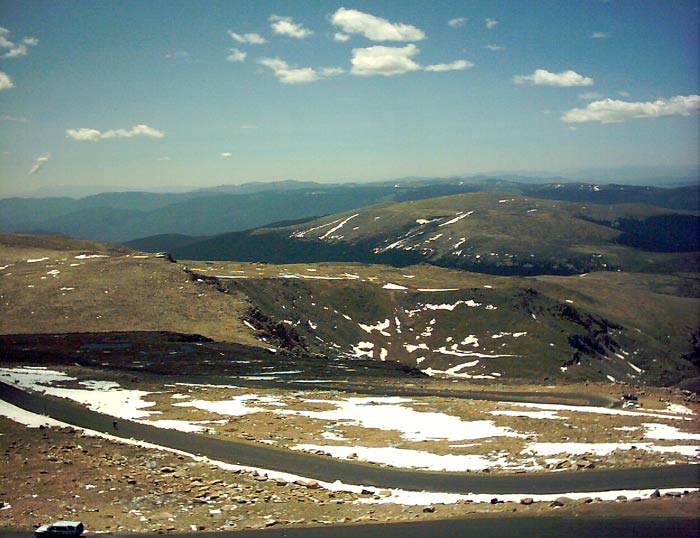 As we traveled higher, we came upon lake after lake, each more spectacular than the last. At one point, the trail snuck through some willows. Since willows are water-loving plants, there was plenty of mud to add some challenge (and potential for amusement). I tried some creative leaping techniques, but that only works to a point :) Some of us were a little more conservative and probably stayed a little cleaner. At the end of the what seemed to be the final lake, 11,400 feet or so, we climbed up past a narrow snowfield and came upon one last spectacular lake, surrounded by towering cliffs. Then we saw our challenge -- to escape the confines of the upper basin, the trail zooms up 1200 vertical feet in only 0.6 miles! Rock-hopping across the stream at the end of the lake, we started up the steep hillside. Eric, who seems to possess mountain goat genes, powered up the hillside, while I brought up the rear. After 25-30 minutes of calf-burning climbing, we reached the crest and saw the real challenge towering another 1500 vertical feet above: Mount Evans. Descending down to the parking lot by Summit Lake, we were surprised to see Dan and Greg, friends from Fort Collins and Lincoln, NE. We continued on to the summit after jogging a bit along the road.