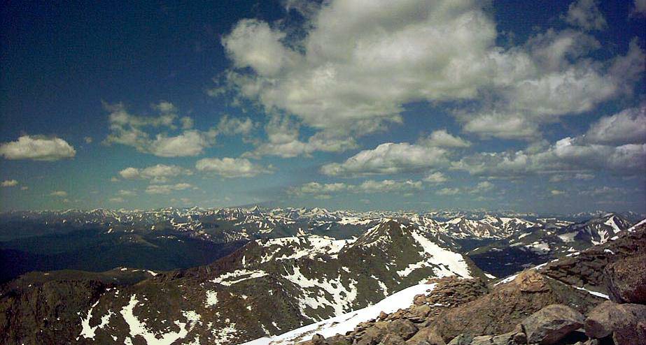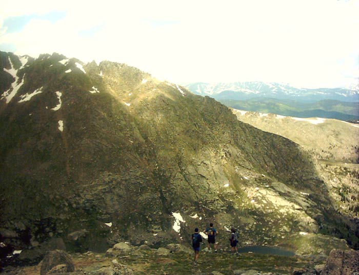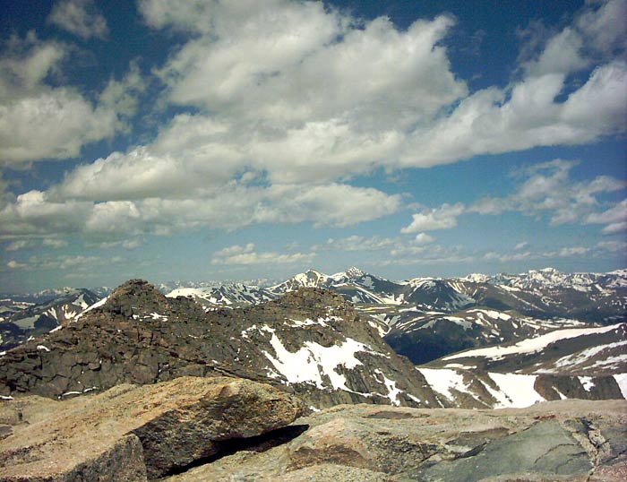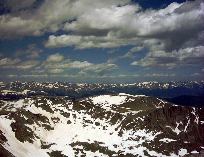 Often, other 14'ers are visible from a given peak. Grays and Torreys lie behind Evan's false summits in the center of the photograph.