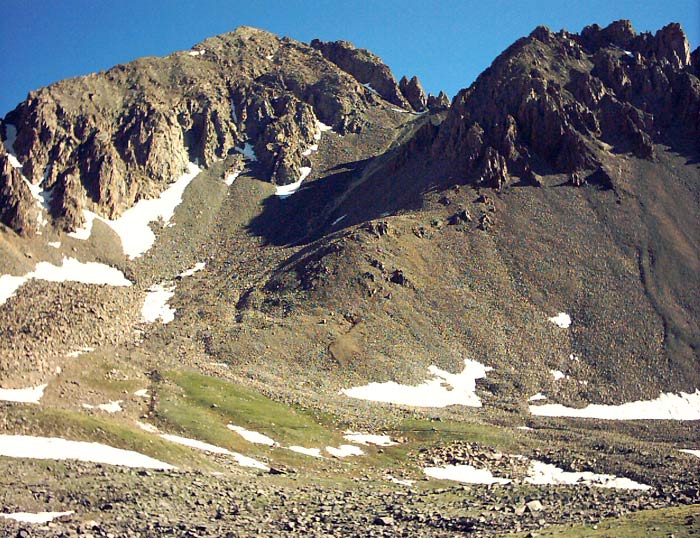 We started hiking from the ... trailhead at 7:30 AM. It took me 2:28:50 to get to the top. Then I spent 24:54 on the summit. The descent took 1:55:49. The thousand foot descent of scree from the saddle (13,500 ft) took only 10 minutes! Total distance was 7.0 miles. Total time was 4:49:36.