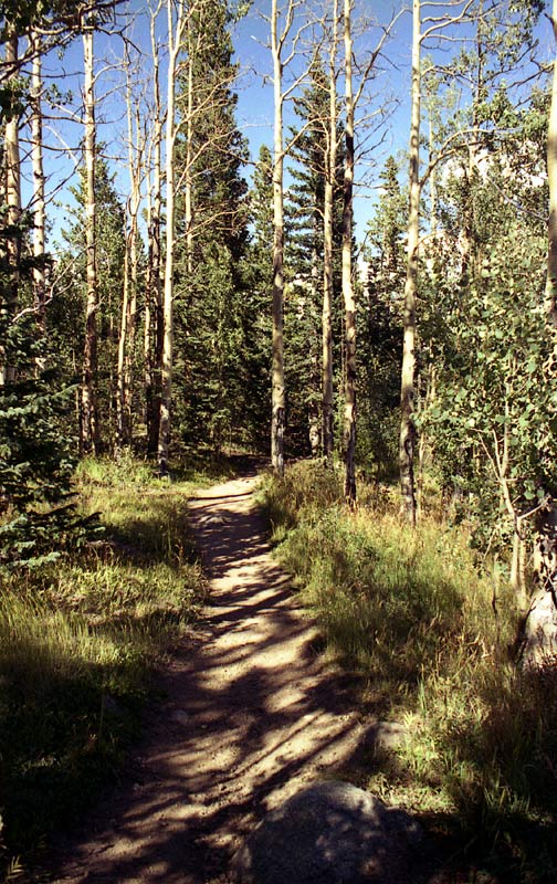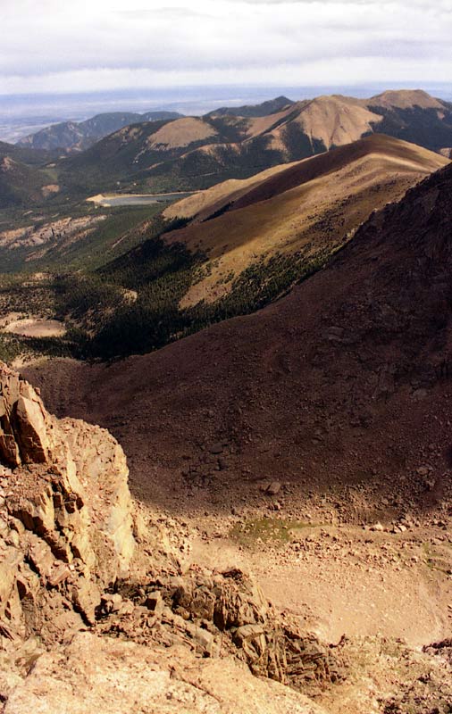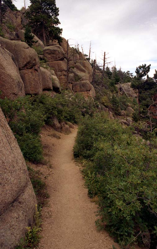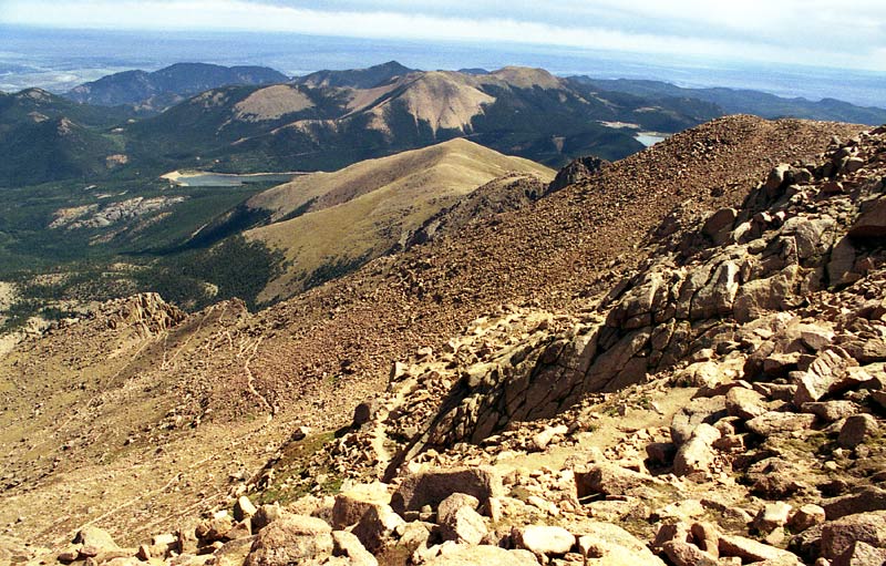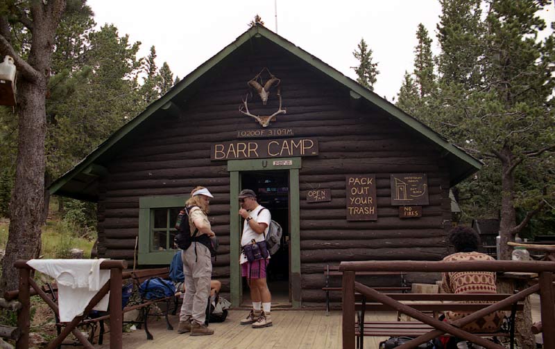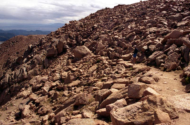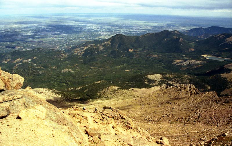 Remember all those switchbacks -- now we got to go down them. We made fairly good time going down (I think we even ran the first couple miles), but soon I 'bonked' -- I ran out of energy, a phenomenon often experienced by runners during the latter stages of a marathon -- this gives an idea of the level of exertion required to do Pikes as a day hike! We stopped for another 20 minutes or so at Barr Camp to get more water and try to force down some food. By this time, I was not feeling very well at all. To add to my misery, my feet were getting beaten up (I was wearing hiking boots) and blistered. Chafing was becoming a problem as well. But we still had 6 more miles to go! As we got lower, it became warmer and warmer until it was downright hot.