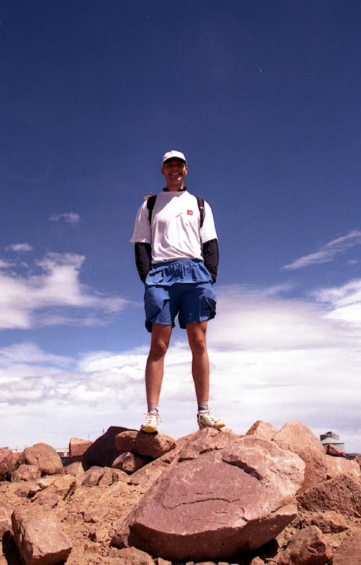 Getting to the top is a bit anticlimactic, because it is basically a huge parking lot with a gift shop. We saw a bunch of tourists walking around, some probably wearing Pikes Peak t-shirts and scarfing down hot dogs from the refreshment stand. The crowd notwithstanding, you can tell by the smiles on our faces that we were quite proud of our achievement! At this point, I actually felt quite bad -- I had pushed myself too hard going up and had gotten the combination dehydration/low blood sugar/altitude combo -- basically, you feel pretty rotten -- headache, nausea, and no energy. Once you reach this stage, it is quite difficult to even think about eating, yet this is the way to come out of it -- get some energy and fluids in your body. It was quite cool on top as well, probably in the low 40's with a stiff breeze.
