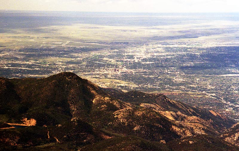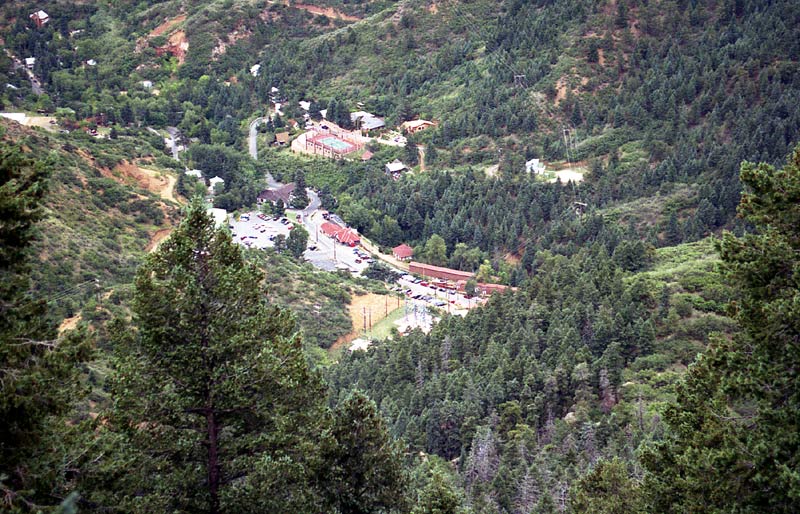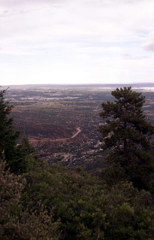 Here is the first good view of Manitou Springs -- only about 2000 feet of descent left. At this point, I was out of energy and hobbling in pain. A huge heel blister had developed on my foot.