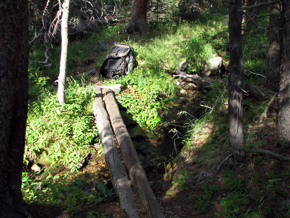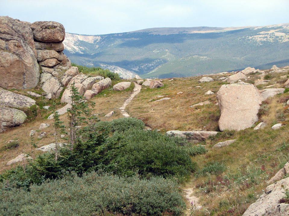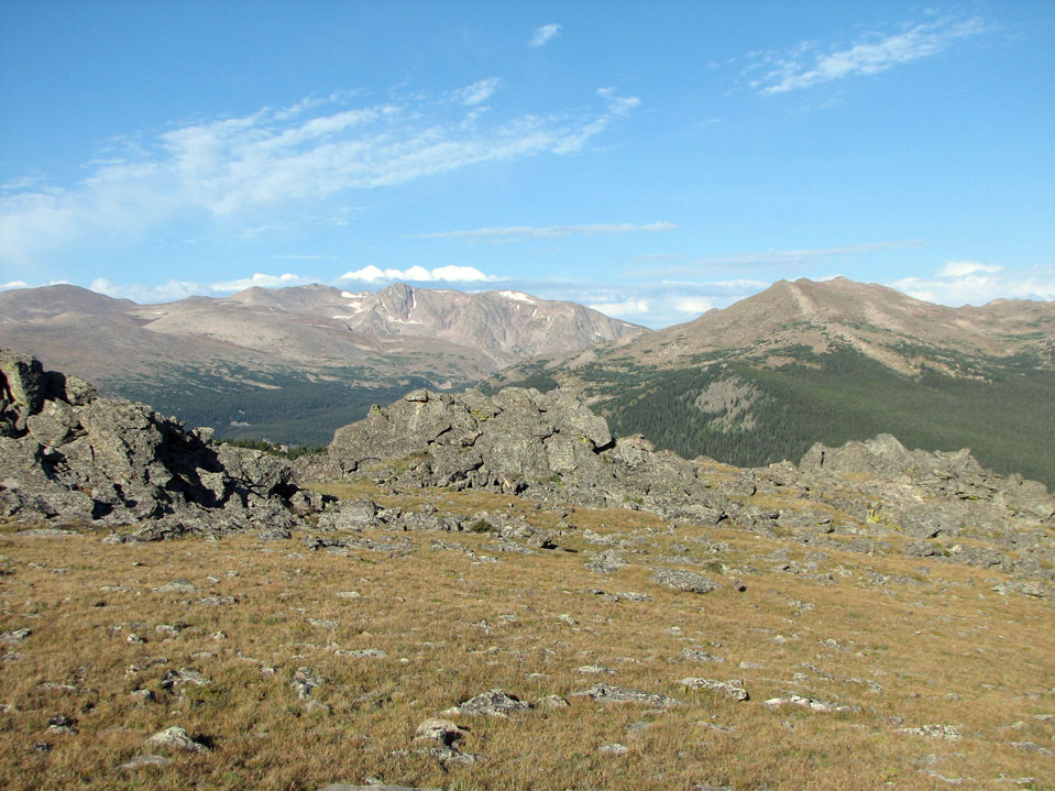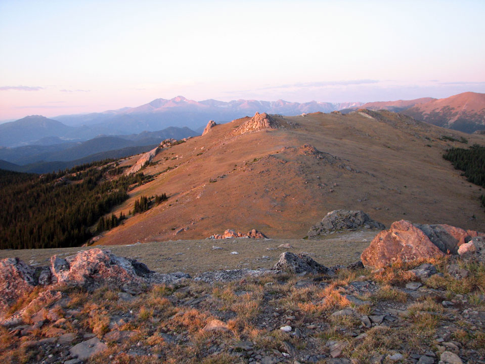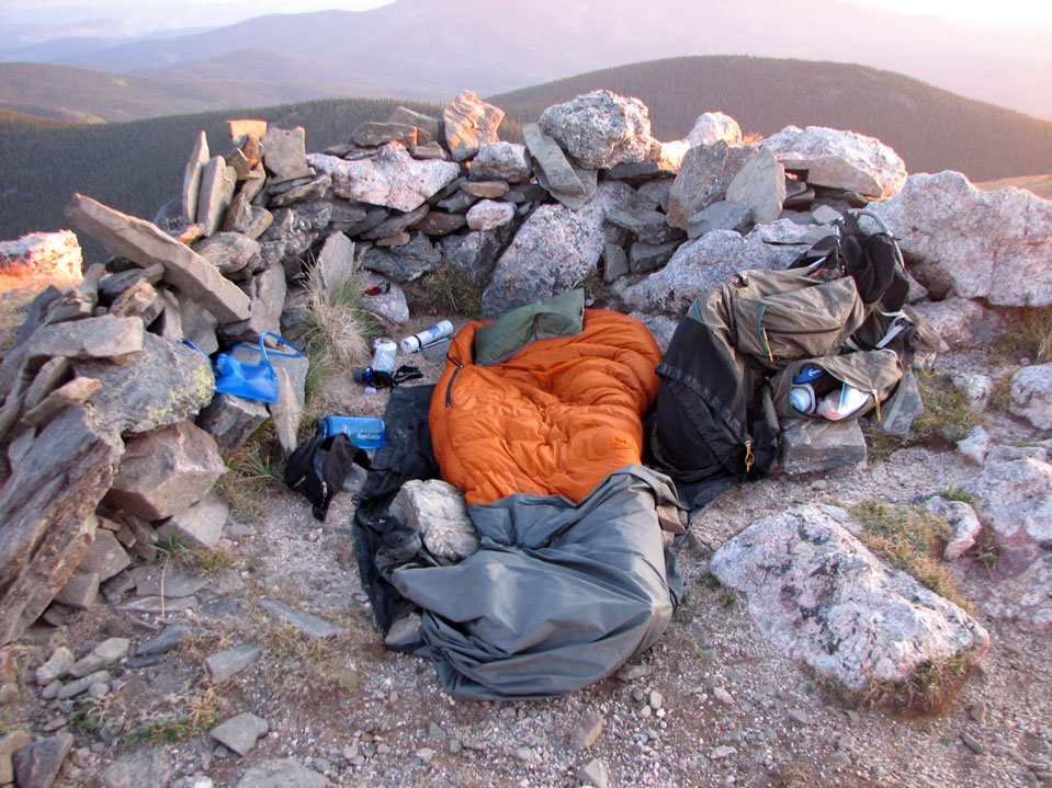 I camped at the very summit of North Signal Mountain (El. 11, 262 feet). This is just outside of Rocky Mountain National Park, so it doesn't fall under their backcountry regulations. What a view!! It can be very windy up there, but the summit rocks offer a bit of shelter if the wind is from the west or north. Anyway, if you try this, make sure you get a good weather forecast - it would be an unhappy place to be during a lightning storm. There are some more sheltered places to camp a few hundred feet down at tree line, or in the last meadow before tree line when coming up the ridge to the summit. This mountain gets quite a few hikers in the middle of the summer, but chances are pretty good that you'll have solitude if you camp up here and leave early enough in the morning. The last person to sign the summit register was back on August 17 - eleven days earlier. Just as I was packing up to leave the next morning, however, a man appeared dressed in camouflage and carrying a cross bow. It was the first day of elk season and he was already looking. I was relieved that it was elk that were being hunted and not summit campers!