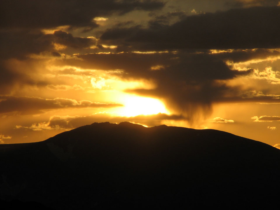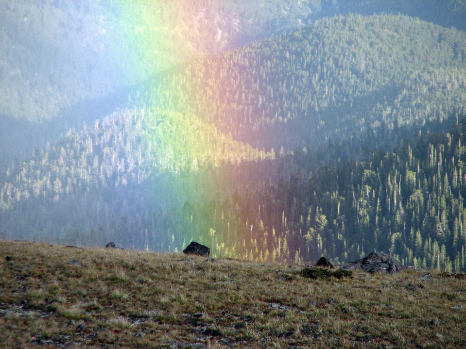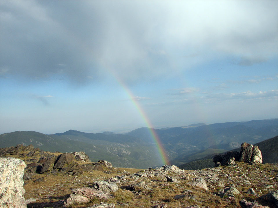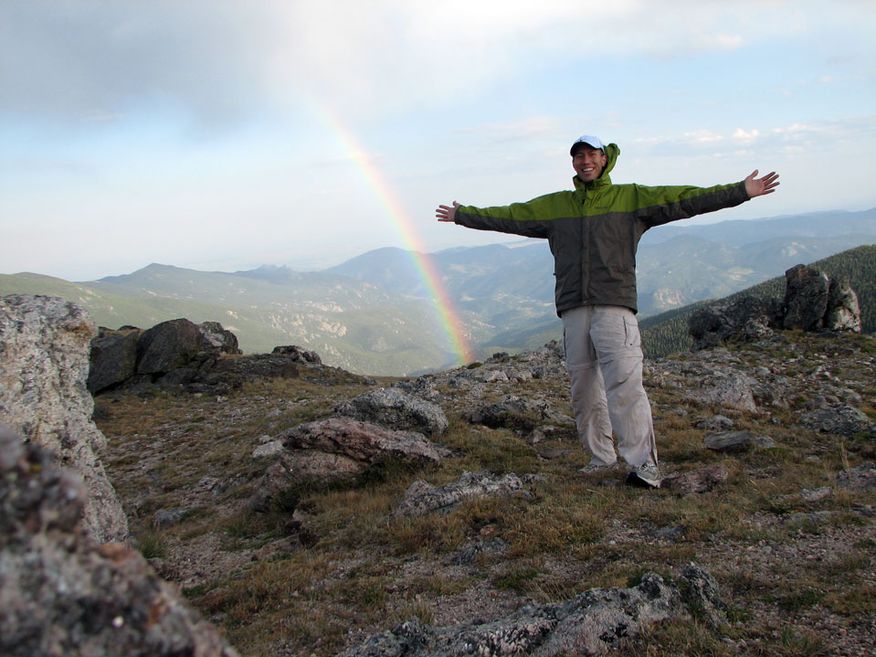 After 5.4 miles and 2700 feet of ascent, I arrived at the summit at about 5:35 PM (total time of 2h07m). About 15 minutes later, a little storm hit with wind and rain. Shortly afterwards, a beautiful rainbow appeared!