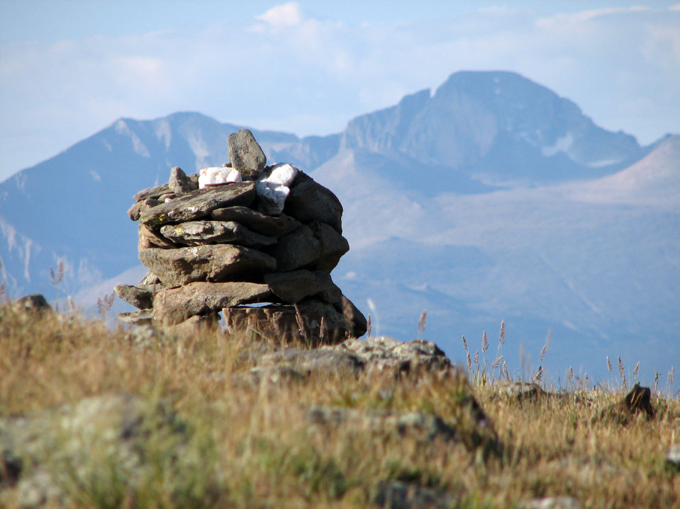 The "trail" over to Stormy Peaks starts off as a series of cairns. You just have to keep an eye out for the next rock pile (sometimes tricky to find). Longs Peak looms in the background.