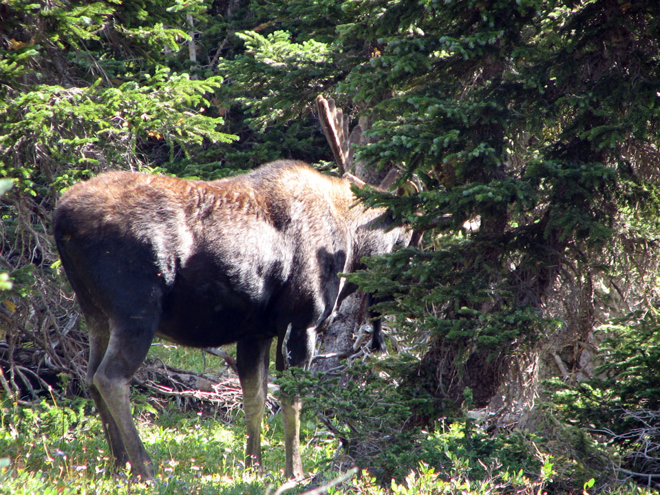 I was lost in my thoughts when I heard a loud snort - I looked up in time to see a huge bull moose staring at me from only about 30 feet away! Moose are probably the most dangerous animals you can encounter in Colorado. And it was getting toward rutting season. Well, he let me know he was there. I stepped around the corner and got out my camera, but by this time he had stepped behind a tree. I snapped this picture and we parted amicably - always a good thing when it comes to moose!