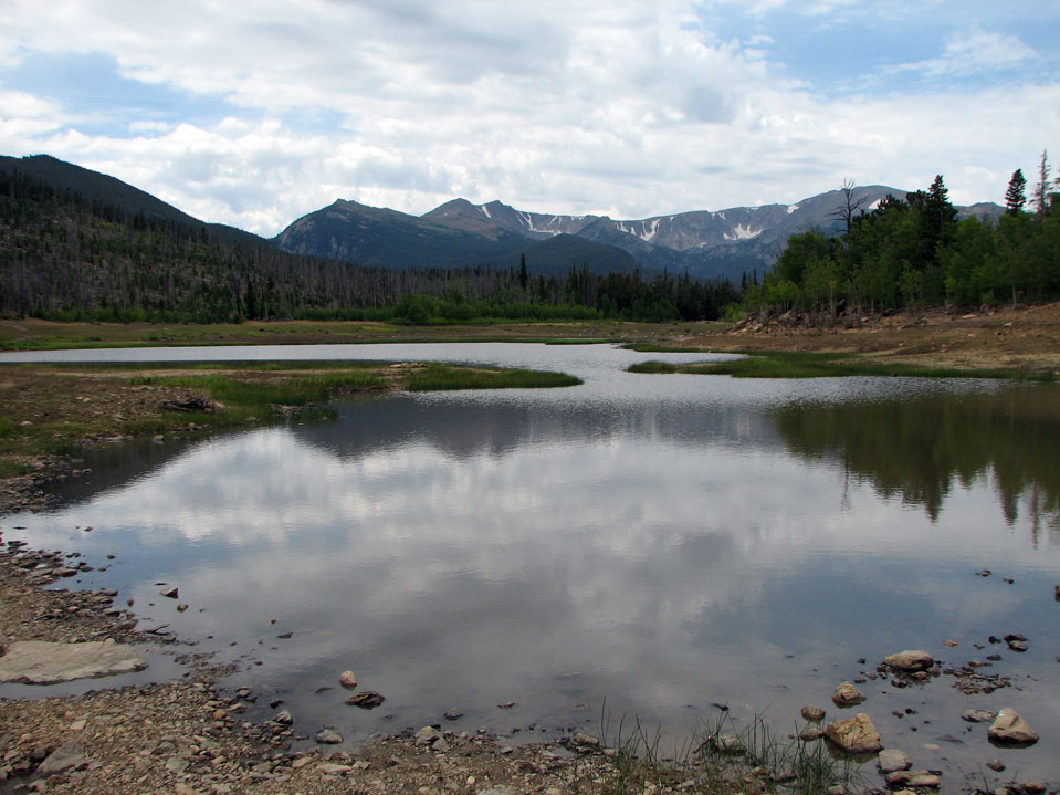 You don't actually have to go all the way to Pingaree Park (which would leave you walking for about 4 miles on hot, dusty road to get back your car at the Signal Mountain Trailhead). Instead you can take a shortcut through Twin Lakes. It's tricky though - a GPS is recommended. If you mess up, you could get stuck in a terrible bog full of downed trees and mosquitoes. This time I found the secret passageway - the trick is to go all the way down the trail PAST the aspens (where the tornado went through in 1990, and a forest fire subsequently burned). When you already have a good view of Pingaree Park and reach about 9350 feet, just past the stretch of young aspens, head east off the trail and up over a rise. The lake is about a quarter of a mile of relatively easy bushwhacking. Keep track of which way you came from - if you mess up, it might be best to get back to the trail and walk the extra 1.2 miles. I felt like taking a dip to refresh, but the lake was almost completely drained (it was nearly full a couple months ago). As I got down to the Pingaree Park road, a nice gentleman drove past in his pickup truck and offered a ride - I accepted, saving me about 1.7 miles. The total distance for this loop (without the kindness of strangers, and with the Twin Lakes shortcut) is about 18.9 miles and 5000 vertical feet. Without the shortcut, this will be just over 20 miles. There is no cell phone coverage for almost the entire route, except you may get a signal from the very top of Signal Mountain (no pun intended) if you know where to point your cell phone (I have Verizon). You'll likely only see people near the ends of the trails. The traverse between Signal Mountain and Stormy Peaks is infrequently traveled - you're pretty much on your own if anything happens. In summary, this is a fantastic route through one of the more remote and beautiful stretches of the Front Range. If any of my friends would like to try this, I'd be happy to take them on this route. The best times to backpack this route are during July and to September. The wildflowers probably peak in mid-July, and the Fall colors probably peak in the middle of September. |