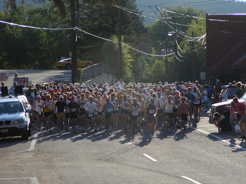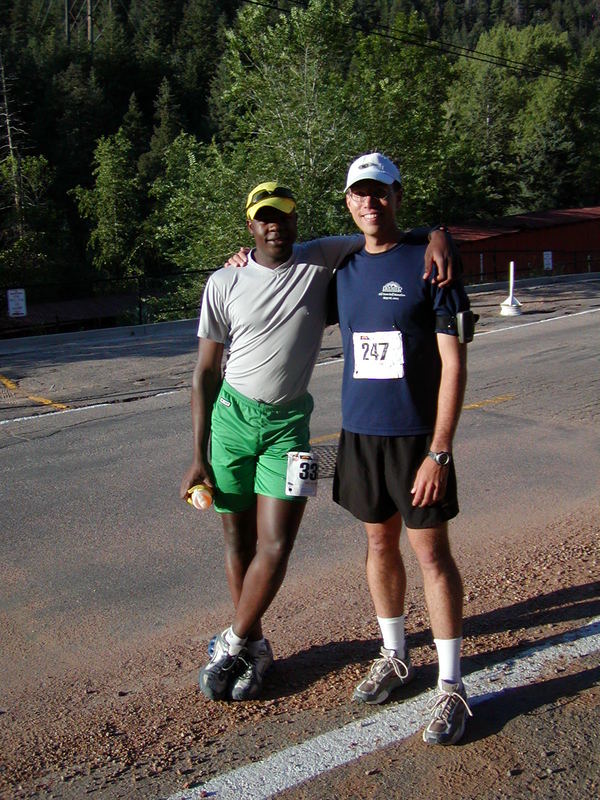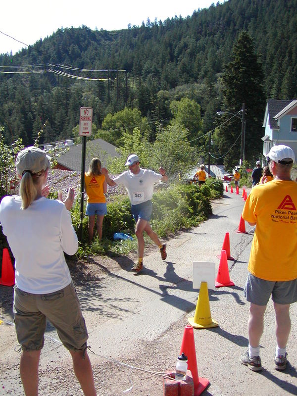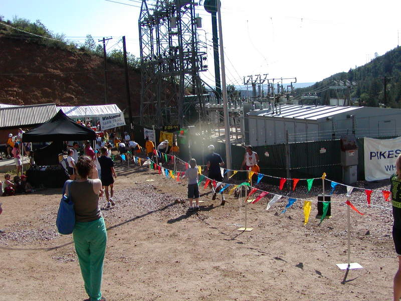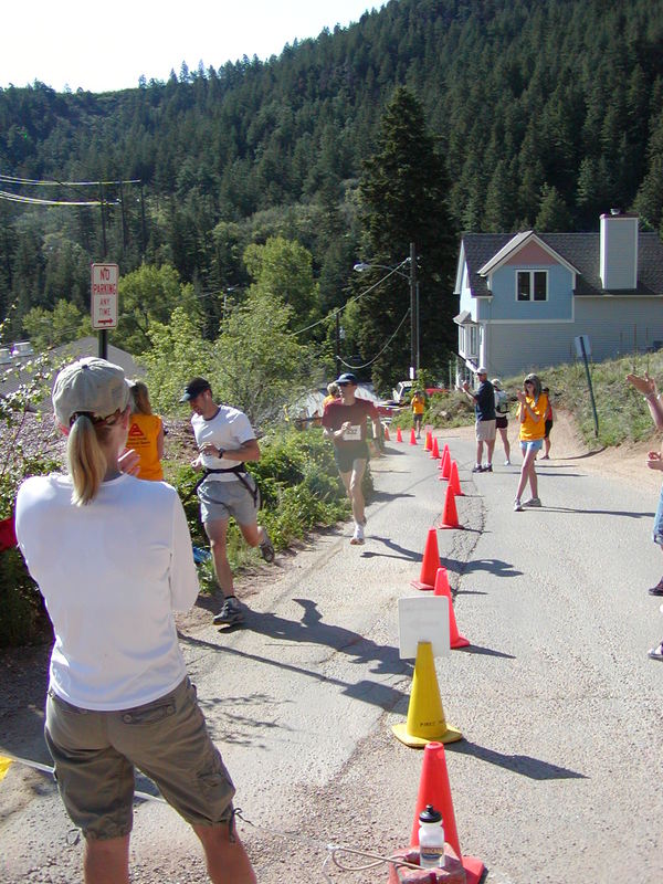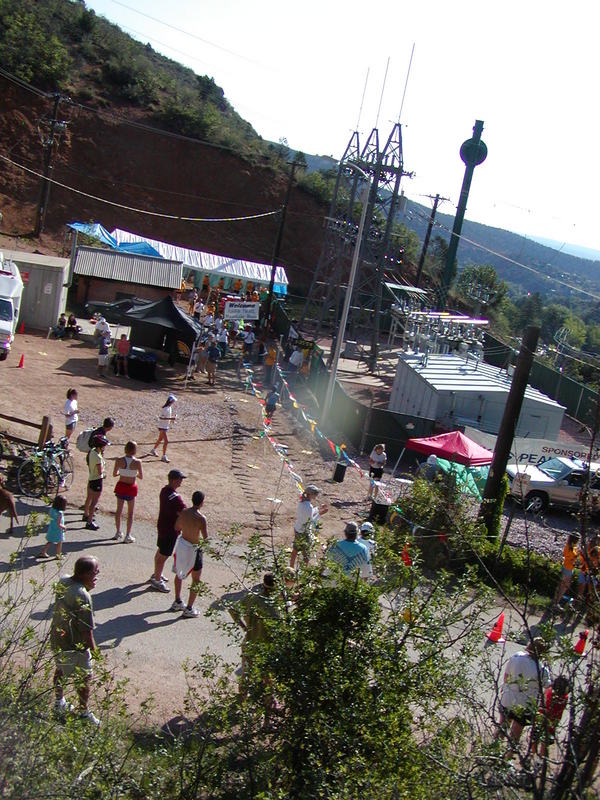 Mike Smith and I drove down from Fort Collins Saturday evening and stayed at a hotel on the north side of Colorado Springs. We figured that the benefit of an extra couple hours of sleep would be worth the cost. Jotham, Eric, and Dan drove down in the morning from Jotham's apartment in Denver. Although it wasn't the best 7 hrs of sleep I ever got, it was a fair amount of rest, and I felt pretty decent when I woke up. I downed a breakfast of a banana and a bowl of Honey Oh's and Eighth Continent Vanilla Soymilk. After arriving to Soda Springs Park, I took my inhaler medicine (to prevent exercise-induced asthma) and jogged up the 3/4 mile hill to the Cog Railway Depot and picked up my race bib. I decided to not waste too much energy on the warmup and just did a few jogs up the hill and back. I made one last visit to the restroom and downed an energy gel and some endurolytes. The temperature at the race start was probably close to 74 degrees and the first few miles are up switchbacks on an east-facing sunlit hill - it was going to be a warm race.