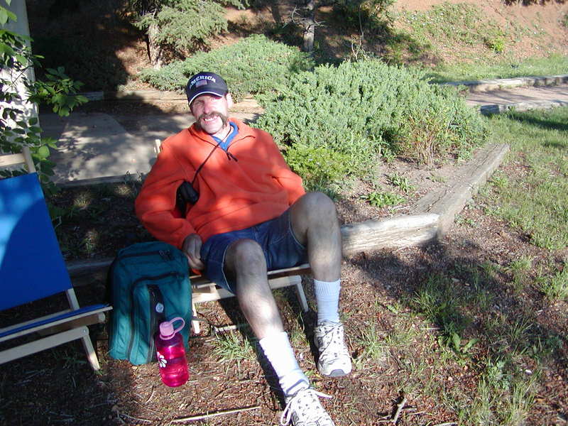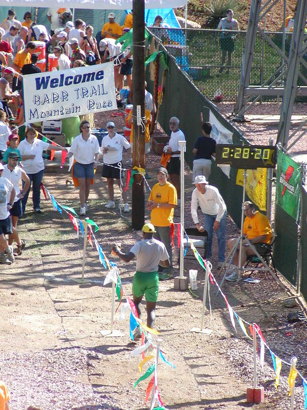 As I cleared the W's, the grade lessened and the temperature decreased to more comfortable levels. I picked up the pace a bit and started gradually picking off people. Very few people passed me from this point on. The crowds had really thinned out by this time and it was quite an enjoyable run. I walked through just about every aid station and usually went for the Gatorade. I took one Carboom energy gel at the 3-mile aid station. Time started passing quickly and I was heartened to see that I had climbed the first 2000 feet in 0:44:35. At about mile 4, the eventual winner, Matt Carpenter came whizzing past, looking smooth and determined, probably running at a sub-5 minute pace! The next runner was a couple minutes behind. So at this point, I had gone about 4 miles and the winner had already gone 8 miles! I soon came upon Eric, chatted for a minute, then pulled away. It was encouraging to see more and more runners coming down the hill, because that meant I was getting closer to the top! There were a few downhill and flat stretches, so my mile-5 split was pretty decent. Mike Smith ran by with Dan close behind. Finally, I could hear the hubub of the Barr Camp aid station!