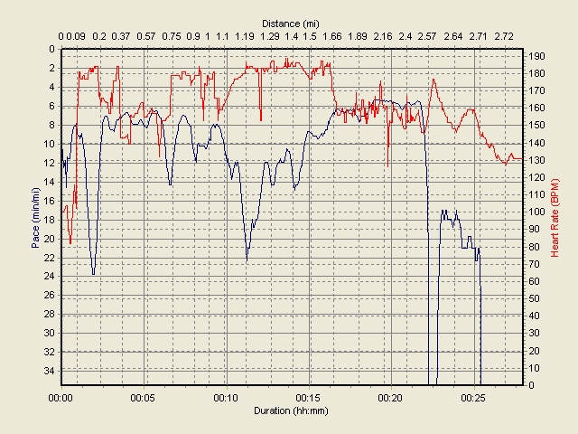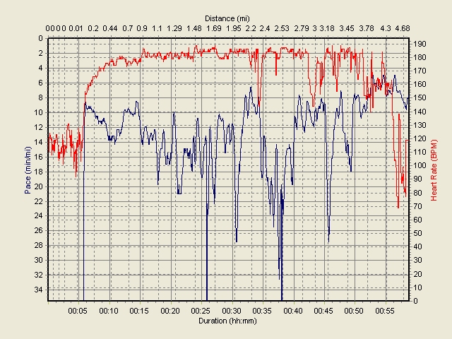 I averaged 5.9 mph, or a 10:15/mile pace. My max heart rate was 187. Best pace was 5:05/mile, but this was only for a short distance.