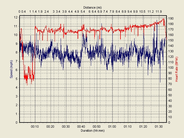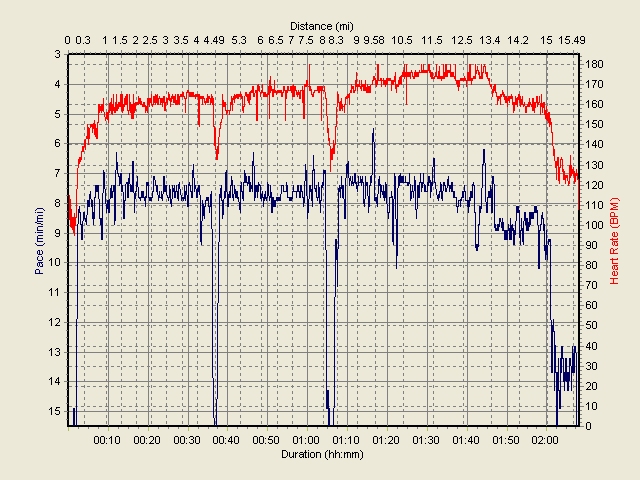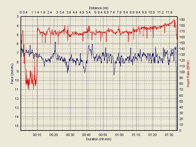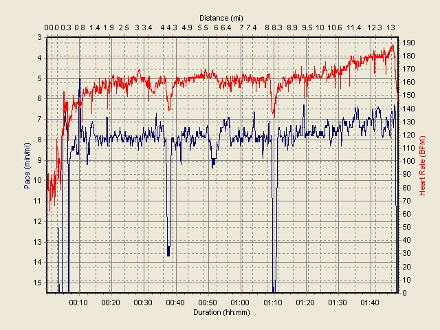 This is the heart rate and pace graph of my training run with Dan Turk on April 24, 2005. We ran the actual course exactly two weeks before the race. This was my first run over 13 miles since December 2004. We took two walking breaks to eat some Gu Energy Gel at miles 4 and 8. We had started conservatively (aiming for 8 min/mile), then tried to pick up the pace 15 sec/mile after mile 9, which worked out quite well. I set a number of PRs during this run (click here to see my PR progression) and finished strong, so I was feeling pretty good about my training thus far.