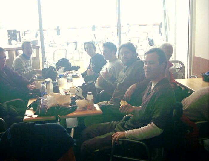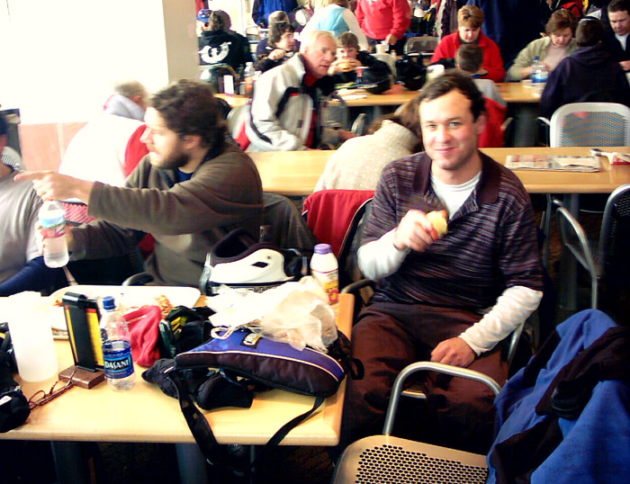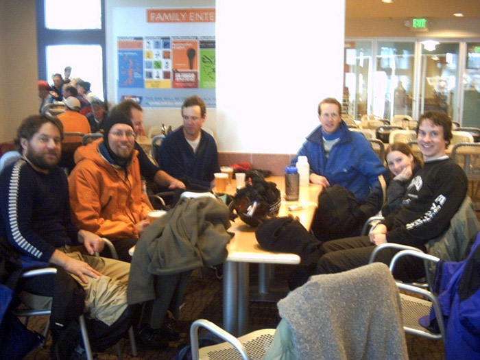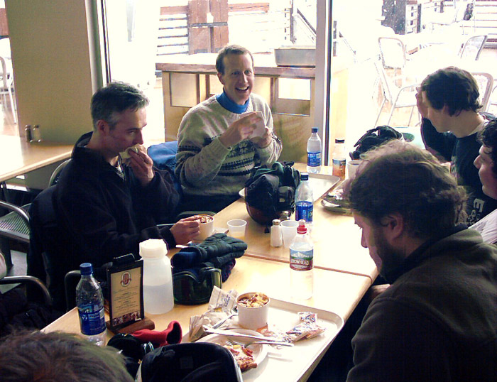 The illustrious class enjoys lunch at the base lodge. The camera lens seems to have been affected by condensation (aptly described mathematically by the Clausius-Clapeyron equation.