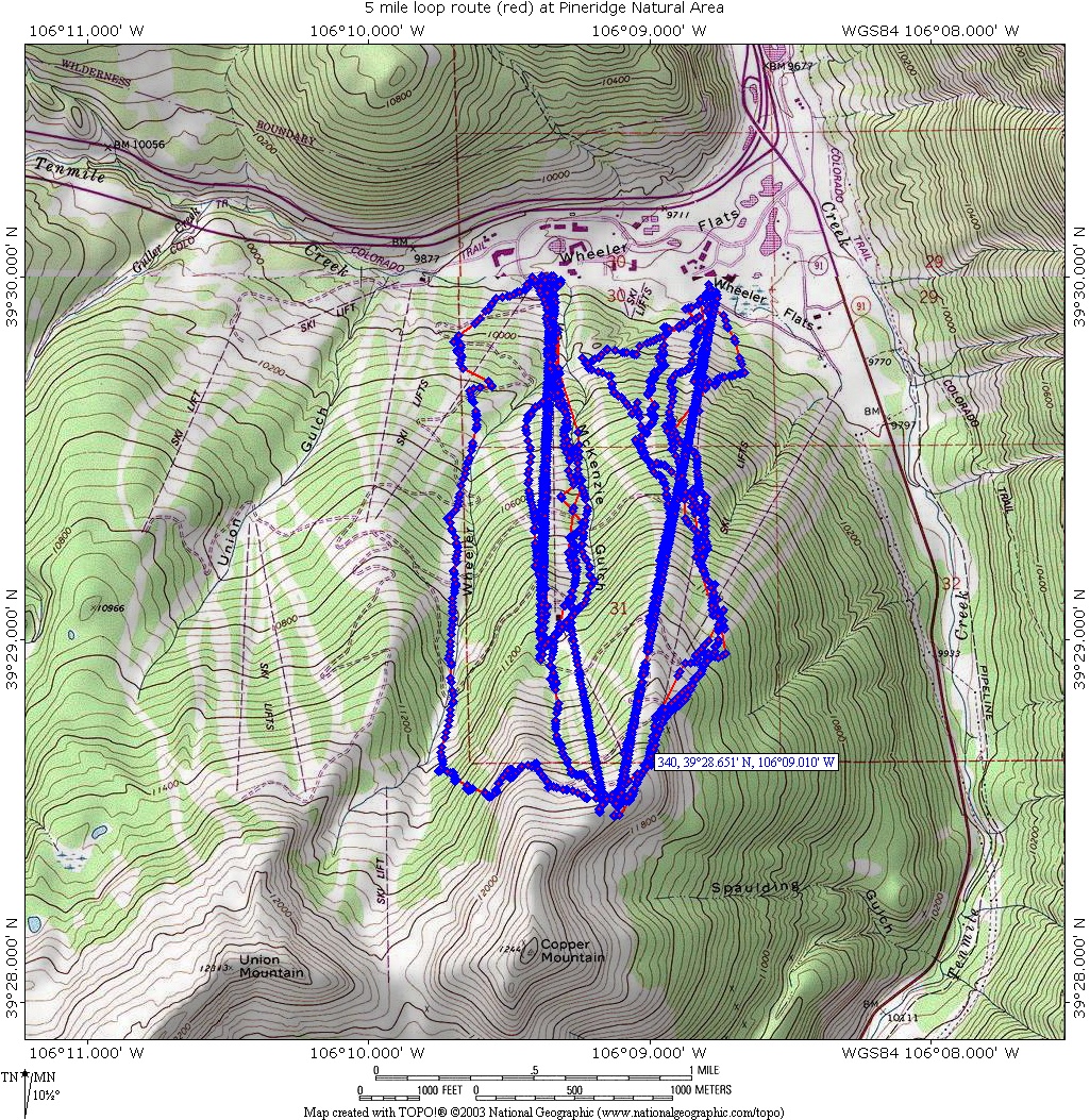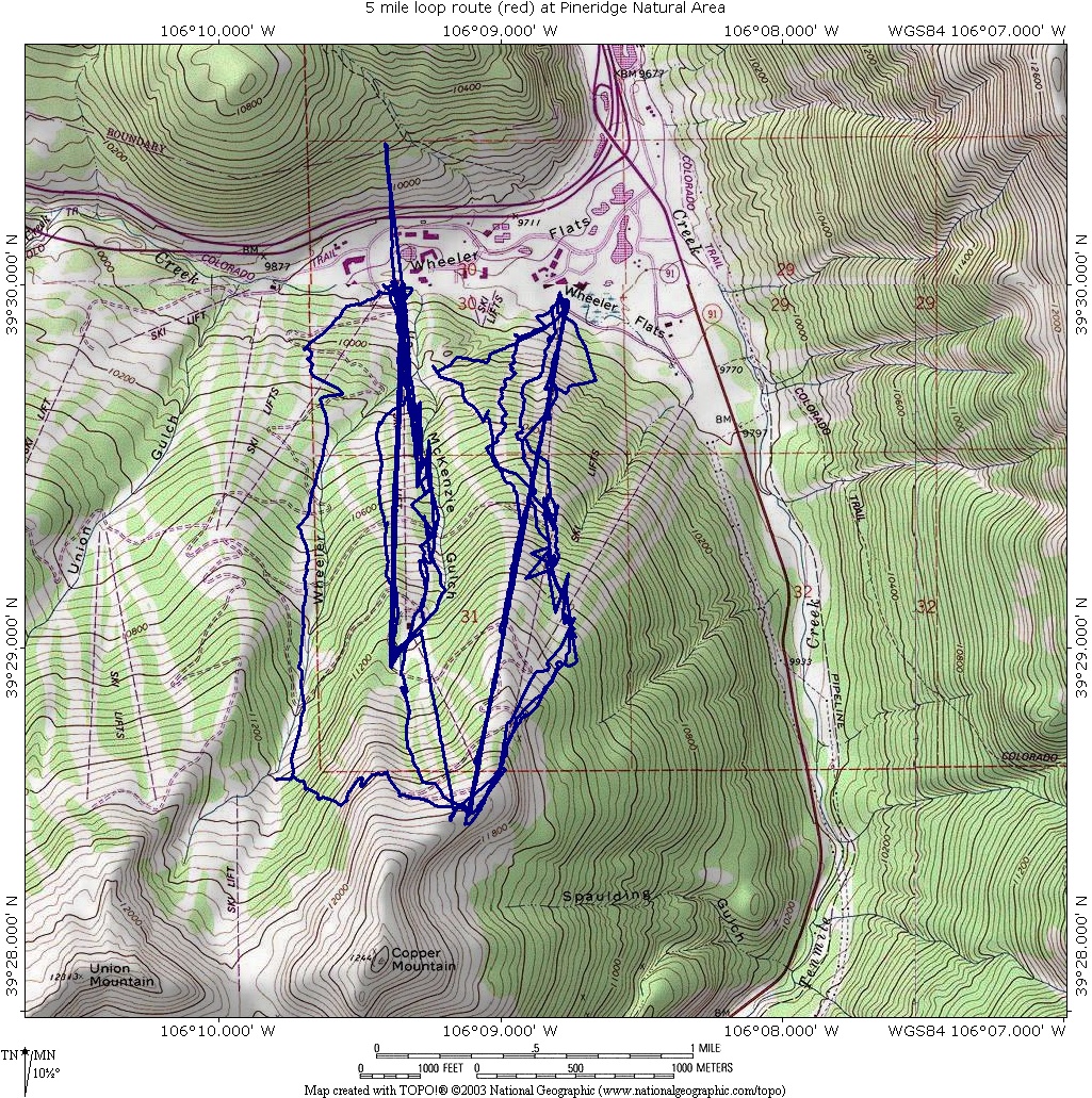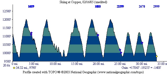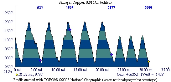 I recently went skiing with the members of the AT 707 class (atmospheric waves and vortices). We had a wonderful day skiing up at Copper Mountain in awesome snow. We had some very interesting and enlightening conversations on the drive to and from the mountain, while riding the lifts, and during lunch and dinner. Topics included the vorticity equation, downslope windstorms, tropical cyclone dynamics and in situ data observations, weather modification, global climate change, the current state of science funding, and other related topics. We also took meteorological surface observations at the bottom and the top of the mountain. During our actual skiing we utilized a GPS to record kinematic details of the ski runs for further analysis. The purpose of this web page is to share some of those details and show a few pictures during the day.