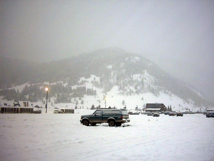 It snowed ALL DAY LONG. Here is the view of the parking lot by sunset.
