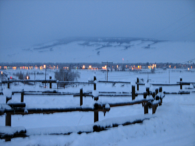 Here's an charcoal-effect view of the fence and parking lot at twilight.