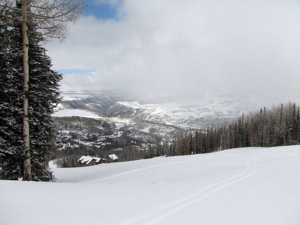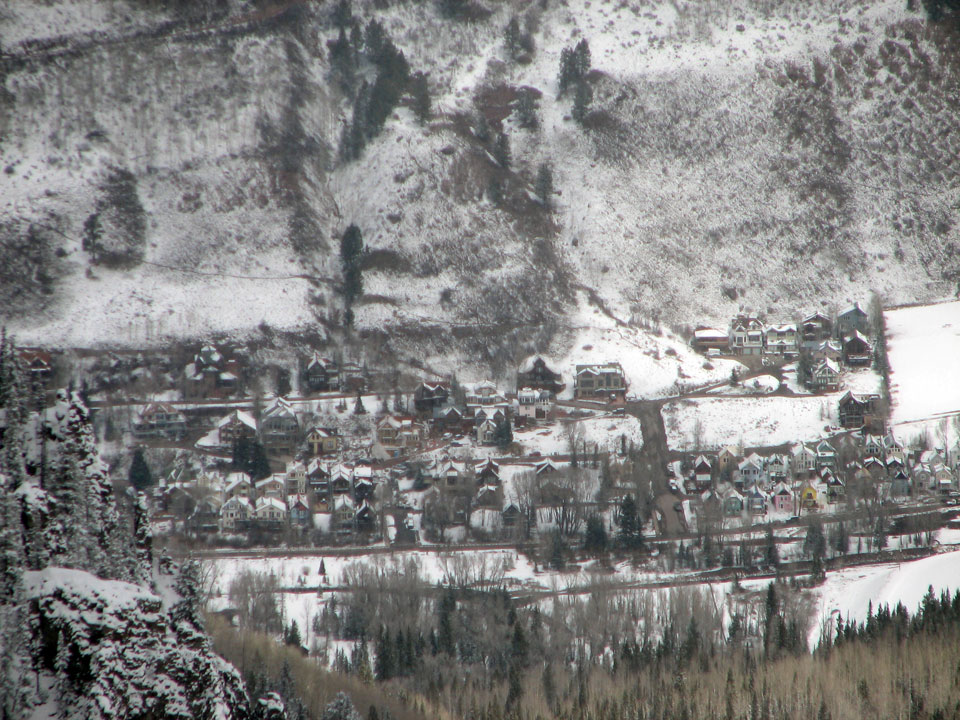 There's the town, yep, right down there! If it looks steep, that's because it is! You can ski all the way down to the town.
