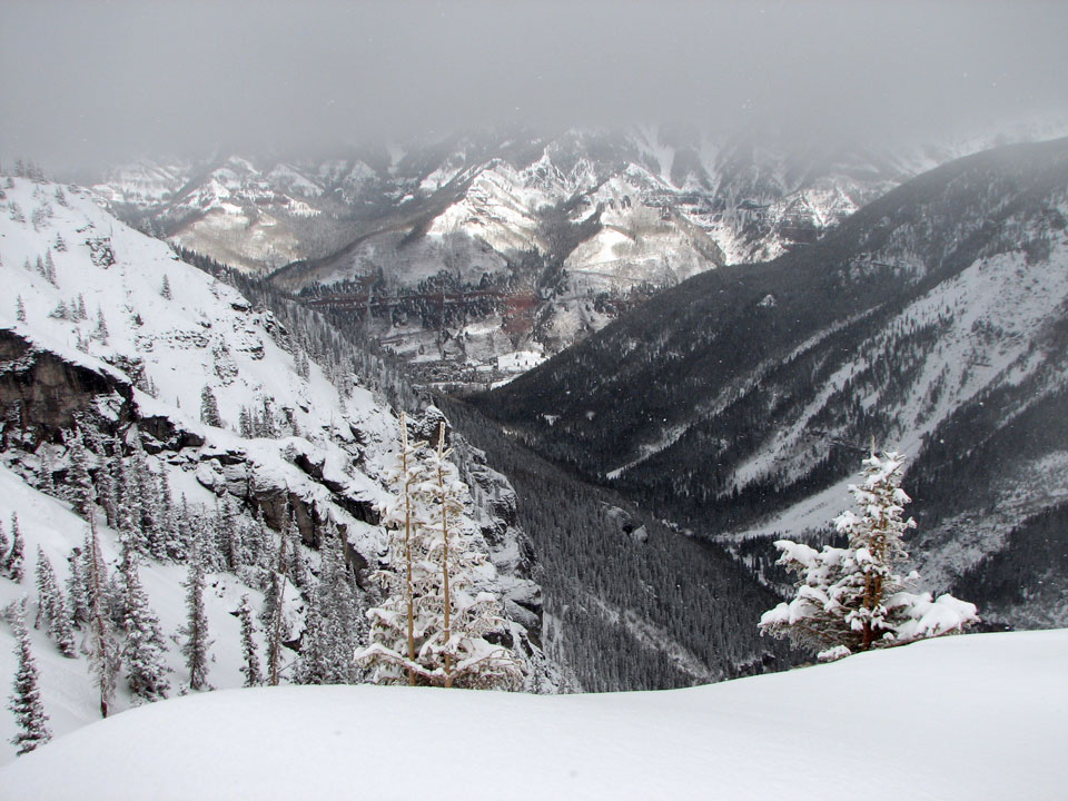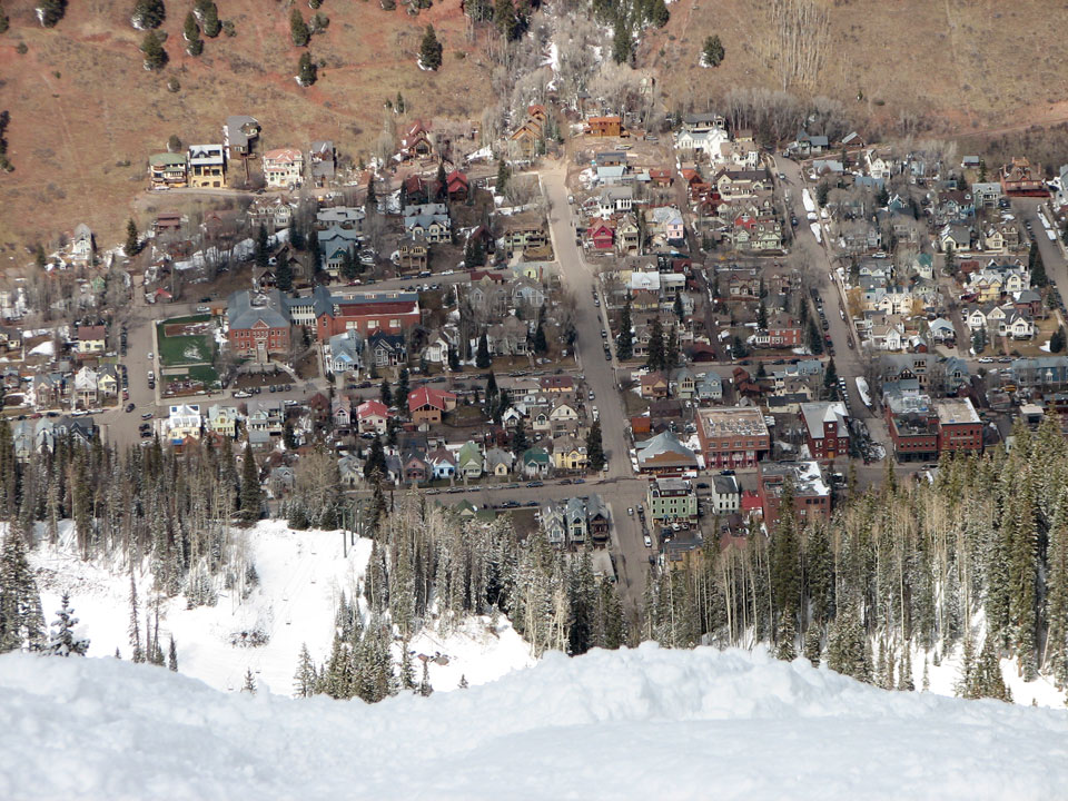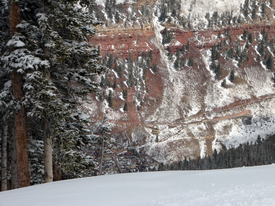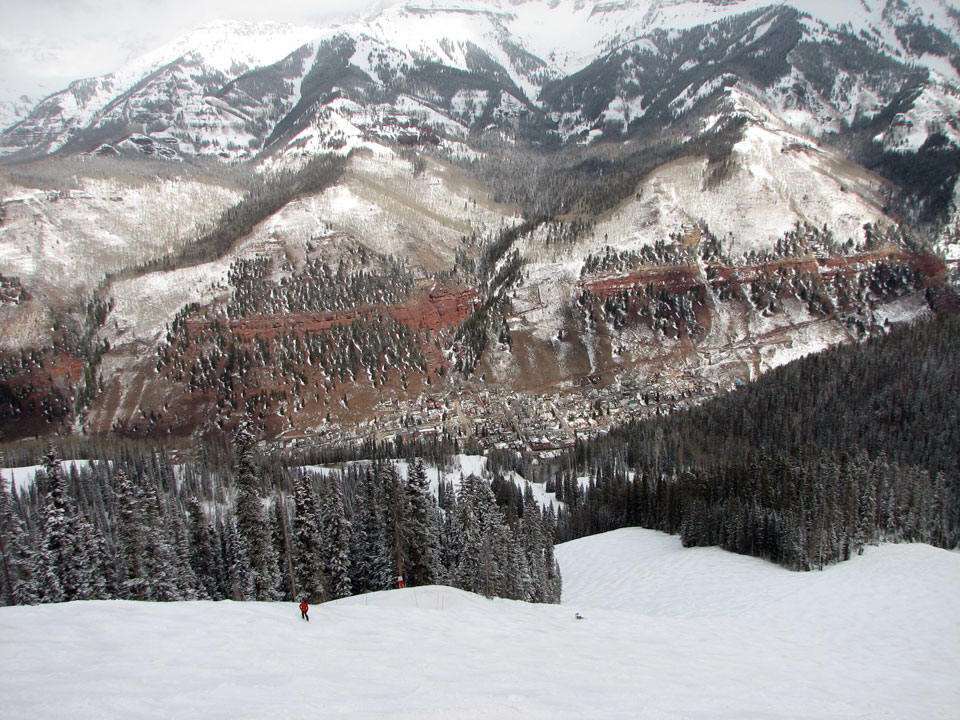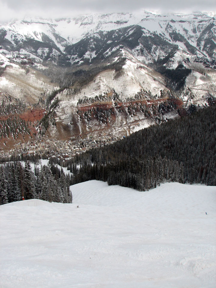 Looking down onto the town of Telluride (from the top of Bushwhacker). This view could give you vertigo! And yep, we skied down it.