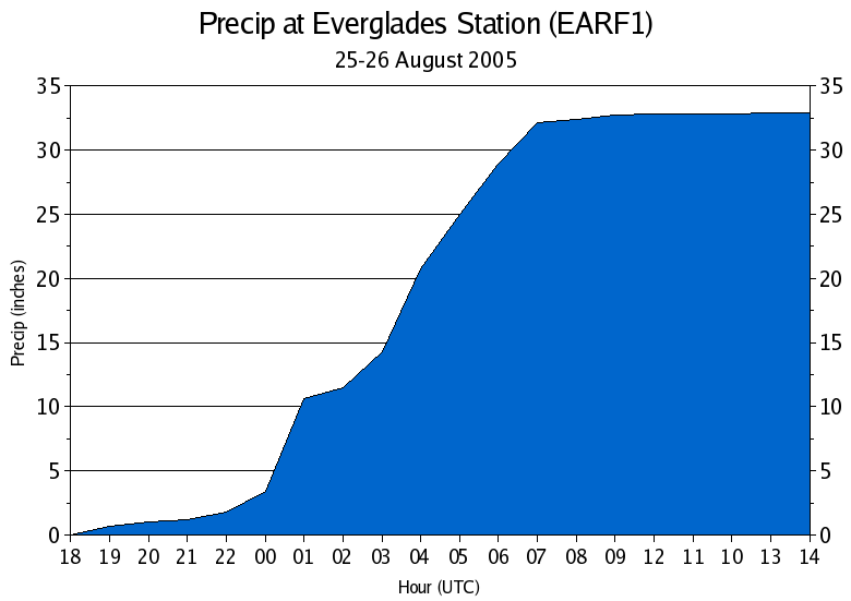 Due to the slow storm motion and unusual southwest track across South Florida, the storm dropped prodigious amounts of rain in the regions that were raked by the south part of the eye. Miami reported a daily record 4.18" the day of landfall, but Key Biscayne, Homestead, Cutler Ridge, and areas in the Everglades experienced much heavier rain. The Everglades Station (EARF1) reported about 29" in 7 hours (and a total of 33" in 20 hours). The peak 1-h rainfall accumulation during this time was 7.2"/h. NEXRAD radar-derived precipitation totals showed a swath of 20+" rainfall in this area, so the measurement may be real, although the official post-storm report has discounted this station. Brian McNoldy produced a time series plot of the rainfall accumulation.